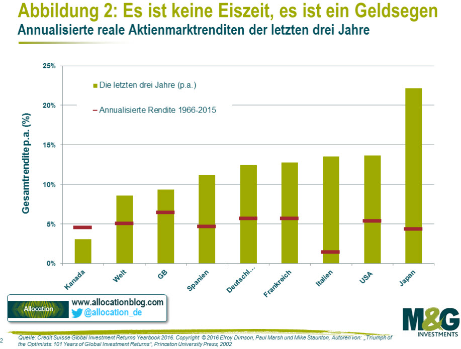 Das ist insofern interessant, als dass wichtige Aktienmärkte – der S&P 500, Topix, Dax und der MSCI World – in den drei Jahren bis Ende Dezember 2015 in der Realität annualisierte nominale Gesamtrenditen von mehr als 10% erzielten.