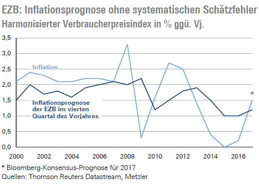 In diesem Jahr dürfte die Inflationsrate sogar mit 1,5 % über der Inflationsprognose der EZB vom Dezember 2016 von 1,2 % liegen und damit positiv überraschen. Derzeit prognostiziert die EZB für 2018 eine Inflationsrate von 1,4 % – ein Wert, der durchaus im Einklang mit einem schnelleren Ende des QE-Programms stehen würde.