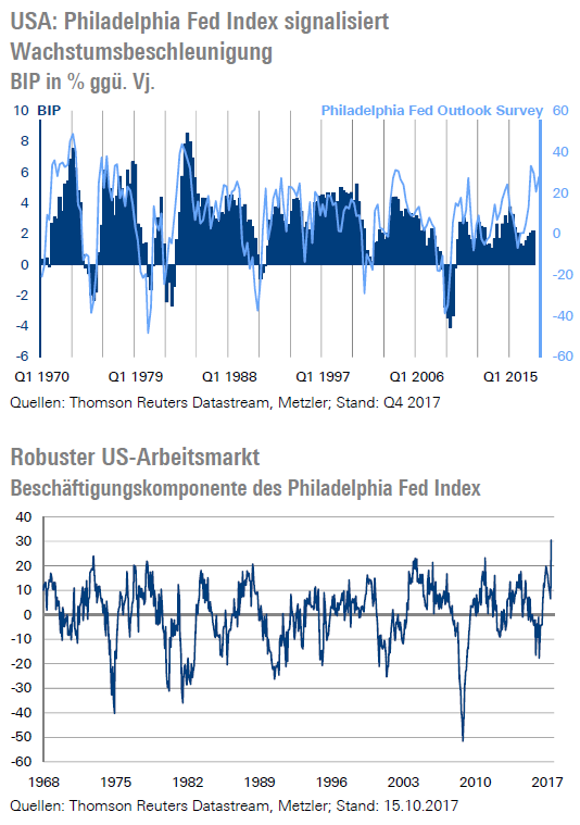 Die Hurrikane Harvey und Irma dürften ihre Spuren im BIP (Freitag) im vierten Quartal hinterlassen und das Wirtschaftswachstum etwas gebremst haben. Die Wachstumsperspektiven haben sich jedoch zuletzt kontinuierlich verbessert, sodass sich das Wirtschaftswachstum im vierten Quartal wieder merklich beschleunigen dürfte. Ein Indikator dafür ist beispielsweise der Philadelphia Fed Index. So ist unter anderem auch die Beschäftigungskomponente des Philadelphia Fed Index im Oktober auf den höchsten Stand seit knapp 50 Jahren gestiegen.