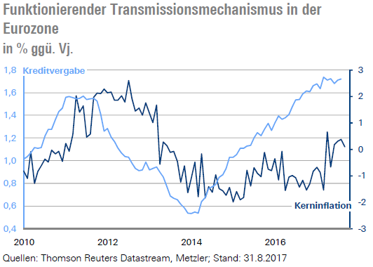 Auch die robuste Konjunktur würde eigentlich für eine schnellere Gangart der EZB sprechen. So dürften die Einkaufsmanagerindizes (Dienstag) und der ifo-Index (Mittwoch) im Rahmen ihrer normalen Schwankungsbreite nach den kräftigen Anstiegen der Vormonate im Oktober wieder etwas gefallen sein, jedoch nach wie vor ein hohes Wachstumstempo der Konjunktur signalisieren. Einen wichtigen Beitrag dazu liefert sicherlich auch die Erholung der Kreditvergabe (Donnerstag), die sich im September erneut beschleunigt haben dürfte.