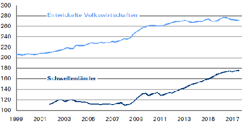Die Verschuldung der Weltwirtschaft ist seit der Finanzmarktkrise 2008 weiter gestiegen – sowohl in den entwickelten Volkswirtschaften als auch in den Schwellenländern. In den entwickelten Volkswirtschaften hat vor allem die Staatsverschuldung als eine Folge der Finanzmarktkrise merklich zugenommen. In der Gruppe der Schwellenländer sticht insbesondere China hervor: Hier hat sich die Verschuldung der Staatsunternehmen deutlich erhöht. Aber auch die private Verschuldung in Hongkong und Südkorea ist in den vergangenen Jahren deutlich gewachsen.