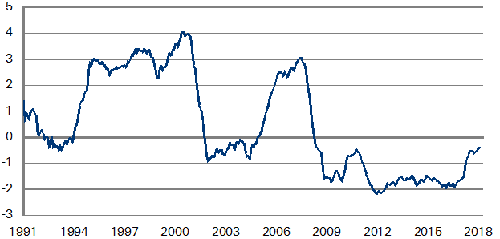 In Europa ist vor allem die italienische Staatsverschuldung von über 130 % des BIP ein großer Risikofaktor. Italien müsste eigentlich den Aufschwung nutzen, um mithilfe von Reformen das Potenzialwachstum zu stärken und um mit Sparmaßnahmen die Verschuldung zu senken. Tatsächlich scheint sich eine neue Regierung aus Links- und Rechtspopulisten anzubahnen, die zwar den Euro beibehalten und in der EU bleiben möchte, aber die Steuern senken und die Reformen zurückdrehen will. Italien könnte damit bald auf Konfrontationskurs zu den EU-Regeln geraten. Aufgrund des QE-Programms der EZB ist allerdings nicht mit einer größeren Reaktion der Finanzmärkte zu rechnen, sodass deutlich steigende Renditen für italienische Staatsanleihen ausbleiben dürften und damit keinen Kurswechsel der Politik erzwingen könnten. Griechenland war so klein, dass ein Austritt des Landes aus der Gemeinschaftswährung verkraftbar gewesen wäre – so saß die EU damals am längeren Hebel und konnte das Land zu den Reformen und Sparanstrengungen mehr oder weniger zwingen. Italien dagegen ist viel zu groß, und ein Austritt des Landes aus dem Euro würde erhebliche Verluste verursachen – vor allem für Deutschland. Damit sitzt die EU diesmal am kürzeren Hebel. Italien hat somit gute Chancen, mit Regelverstößen durchzukommen und dürfte perspektivisch auf umfangreiche Transferleistungen der EU hoffen können. Es liegt zu sehr im Eigeninteresse der anderen EWU-Mitgliedsstaaten, dass Italien nicht aus dem Euro austritt und keinen Staatsbankrott erleidet.
