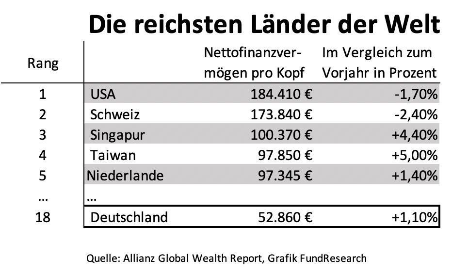 Blickt man also ausschließlich auf das vergangene Jahr, scheint es so, als ob die Bundesbürger alles richtig gemacht hätten. Netto haben die deutschen Sparer derzeit durchschnittlich ein Vermögen von rund 53.000 Euro pro Kopf. In der Liste der reichsten Länder der Welt belegt Deutschland damit den 18. Rang.