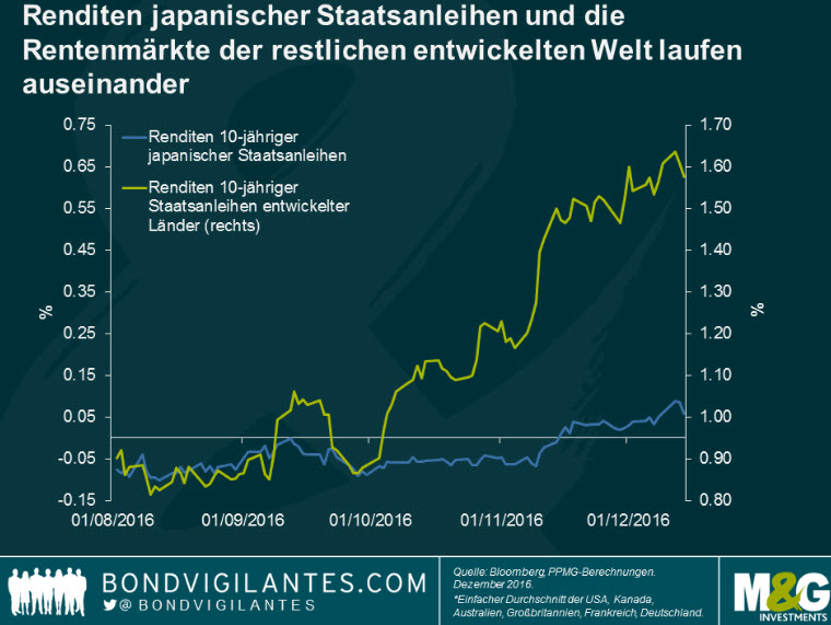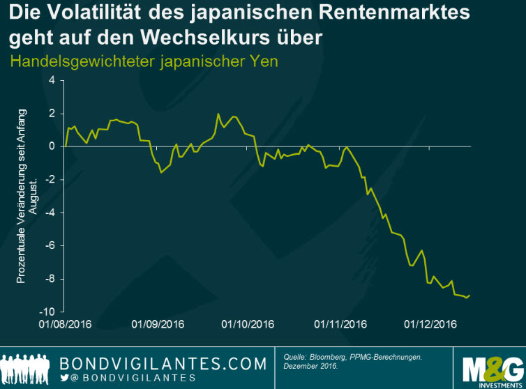Durch die Einführung der Zinskurvenkontrolle hat die BoJ den japanischen Rentenmarkt auf eine gewisse Art und Weise von den internationalen Entwicklungen isoliert. In der Folge ging die Volatilität der Rentenmärkte auf den Wechselkurs über. Da der Yen ein Transmissionskanal ist, wäre das Szenario eine Yen-Aufwertung (beispielsweise im Fall eines sinkenden US-Dollars aufgrund von Protektionismus in den USA) ein wichtiger Faktor, den es zu beobachten gilt.