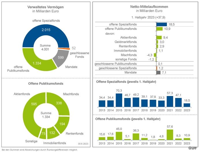 Vergleichsweise bescheiden nehmen sich im Vergleich dazu die Mittelzuflüsse in offene Publikumsfonds aus. Ihnen flossen im ersten Halbjahr laut aktueller BVI-Statistik netto 10,9 Milliarden Euro zu. Davon wurden 5,9 Milliarden Euro in Geldmarkt- und Rentenfonds investiert.Das Neugeschäft der Geldmarktfonds hat vor allem im zweiten Quartal angezogen. Rund fünf Milliarden Euro wurden investiert, nachdem im ersten Quartal knapp zwei Milliarden Euro abgeflossen waren. Rentenfonds verzeichneten in diesem Jahr Zuflüsse von 2,9 Milliarden Euro.