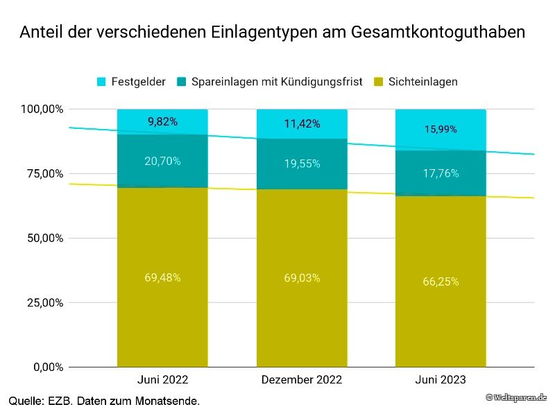 Deutschland ist kein Land der Aktionäre. Traditionell parkt die Mehrheit der Deutschen ihr Erspartes lieber auf Giro-, Tages- und Festgeldkoten, als es dem Aktienmarkt anzuvertrauen. Das Vertrauen in die Börse wuchs in den vergangenen Jahren zwar etwas, dank der Nullzins-Politik der Europäischen Zentralbank. Doch seit deren Kurswechsel, mehrerer aufeinanderfolgender Leitzins-Anhebungen und den entsprechenden Reaktionen am Kapitalmarkt, ist die tief verwurzelte Sehnsucht nach Verzinslichem bei den deutschen Sparern wieder zurück. Das zeigen die aktuellen Daten der Europäischen Zentralbank. Demnach ist das Festgeldguthaben in Deutschland in den ersten sechs Monaten dieses Jahres von knapp 309 Milliarden auf mehr als 432 Milliarden Euro gestiegen. Das ist der höchste Stand seit 14 Jahren. Damit ist auch der Anteil der Festgelder am gesamten Kontoguthaben nun auf 16 Prozent gewachsen. Im Juli 2022 betrug dieser noch knapp unter 9,8 Prozent und lag damit auf einem historischen Tiefpunkt.