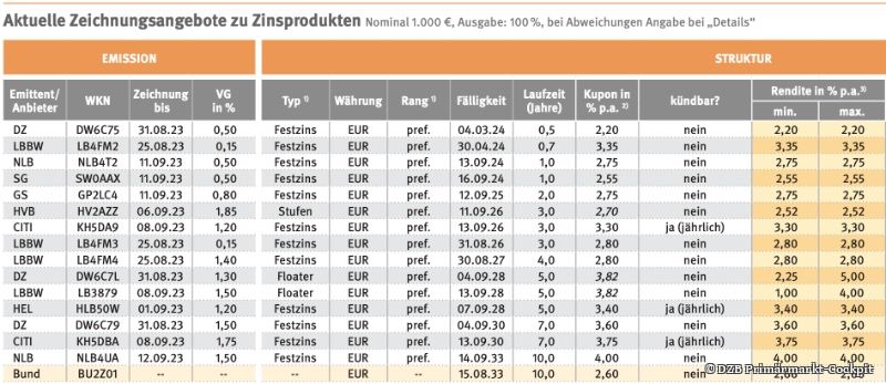 Sieht man sich die in der Zeichnung befindlichen Produkte an, ist die Realität ernüchternd. Laut einer Untersuchung des DZB Primärmarkt-Cockpits sind Bundesanleihen mit kurzer Laufzeit attraktiver als die meisten Zinsprodukte. Einzig die LBBW hat mit ihren Kurzläufer-Produkten passende Konditionen im Angebot.